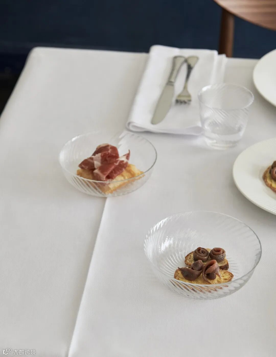 透明的玻璃材质纯粹,作为盛放食物的容器,以一种更为简单的表现方式来描述味觉的体验。