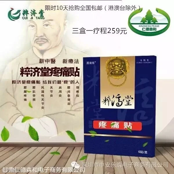 【产品名称】粹济堂疼痛贴 【产品配方】川穹、桂枝、白芷、生姜、薄荷、透骨草、樟脑、冰片、鸡血藤、辣椒、冬青、益母草。 【保健功能】缓解疼痛。 【适宜人群】适用于因风湿、关节炎、、腰椎间盘突出、肩周炎、坐骨神经痛、腰腿疼痛、颈椎病、骨质增生、腰肌劳损、跌打损伤等引起疼痛的人群。 粹济堂疼痛贴制作工艺精细,采用专利技术和组合透皮吸收技术及先进的工艺设备精炼而成,摆脱传统膏药对铅等重金属的依赖,做到黑膏药与巴布剂药膏完美的结合,使药效相辅相成,达到1+1>2”的效果。对腰颈椎病、风湿骨病、肩周炎等疾病有显著的效果。 粹济堂严格遵循祖传数百年的秘制古配方,秉承清代大医学家王清任师祖的用药理念,做到配方、药材专选,经过20多年临床试用研究,实现了传统秘方与现代工艺的相结合,是传统中医理论创新发展的结晶,使粹济堂疼痛贴彻底摆脱对铅粉等重金属的依赖。 【不适宜人群】孕妇、哺乳期妇女、儿童、婴幼儿及皮肤过敏者。 【规 格】6贴盒 【使用方法】将疼痛处洗净,贴于疼痛部位,每贴可使用三天。 【注意事项】1、外用。2、皮肤破溃处禁用。3、如使用本品后皮肤出现红斑、肿胀应停止使用。4、本品为保健用品,不作为药品使用。 【贮存方法】密封,置阴凉干燥处。 【执行标准】Q/JDY05-2014 【卫生许可证号】吉卫健证字(2012)第0022号 【批准文号】吉卫健用字[2014]第061号 【生产企业】吉林省东颐生物科技有限公司 【生产企业地址】长春经济技术开发区金川街1636号 慎重承诺:三天无效退款