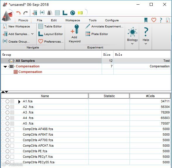 新版FlowJo的强大功能之一是可以把文件名含compensation关键词的文件自动归类为补偿组