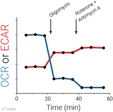 哺乳动物细胞中,糖酵解和氧化磷酸化(OXOHOS)途径提供大部分的细胞ATP。氧化磷酸化消耗O2,驱动氧气消耗速率(OCR),这两条途径都能导致检测液酸化。葡萄糖通过糖酵解转换成乳酸,每分子乳酸伴随着一个H+流出,而TCA循环使ETC/氧化磷酸化产生CO2,也会导致检测液酸化。这些反应的总和是细胞外酸化(ECAR)变化的主要驱动因素。