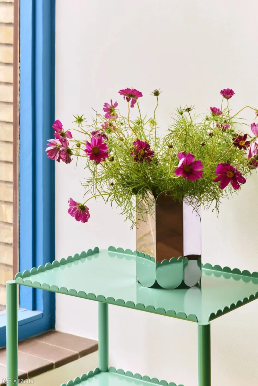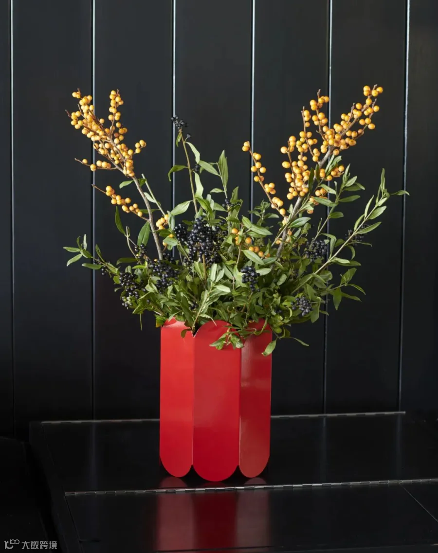Arcs Vase 由一块不锈钢板制成,顶部与底部呈现柔和圆润的扇形弧线,以极简而富有线条感的轮廓包围住花束,形如室内的小花圃,在窗台或茶几之上,在角落空间,绽放活力。