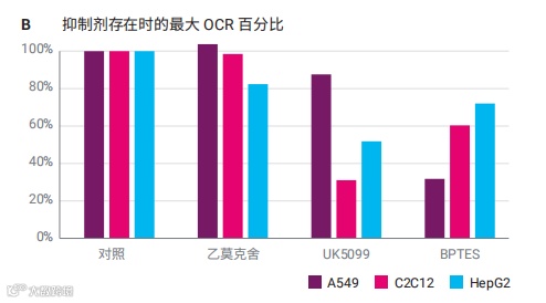 例如,在 A549 细胞中(图 5A),对 BPTES 的响应较大,而对 UK5099 的响应较小,对乙莫克舍无响应。这表明,A549 细胞在高底物需求条件下对谷氨酰胺氧化的依赖程度较高。相比之下,C2C12 细胞对 UK5099 和 BPTES 均表现出显著的响应(图 5B),表明这两种底物都是细胞在最大底物需求条件下所需要的。相反,在最大呼吸条件下,HepG2 细胞对葡萄糖/丙酮酸、LCFA 和谷氨酰胺表现出更平衡的依赖性(图 5C),因为结果表明对 UK5099、乙莫克舍和 BPTES 都有显著的响应。图 7 总结了添加抑制剂后 3 种细胞类型的基础 OCR 百分比以及存在抑制剂时的最大 OCR 百分比。值得注意的是,在底物需求增加的条件下,评估线粒体底物依赖性时,最大呼吸的变化是最有用的参数。