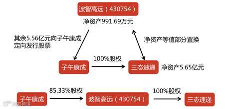子午康成持有的三态速递100%股权的等值部分(991.69元)与波智高远进行置换,同时差额部分由波智高远定向发行的5.56亿元股票进行填补。交易完成后,波智高远持有三态速递100%的股权,而子午康成则持有波智高远85.33%股份,子午康城实际控制人许一成为波智高远的实际控制人,子午康成子公司三态速递则成功借壳。