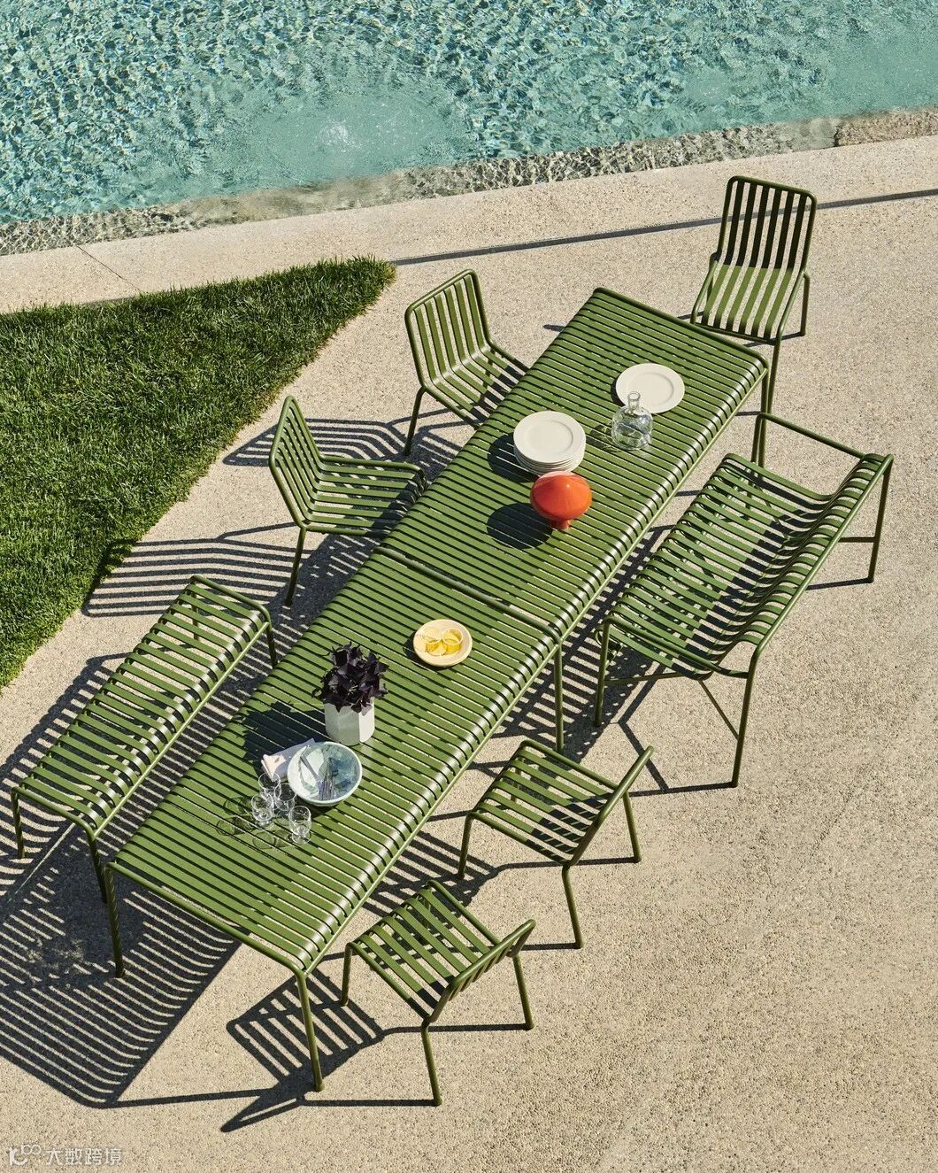 Palissade 户外桌椅系列,由法国设计师兄弟Ronan & Erwan Bouroullec 设计,采用粉末涂层或热镀锌钢,耐旱耐湿,适合户外环境使用。