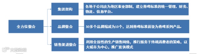 在完成了大规模兼并之后,青啤集团在并购过程中实行了以下三大版块的深度整合,最终成为中国啤酒业的巨头。