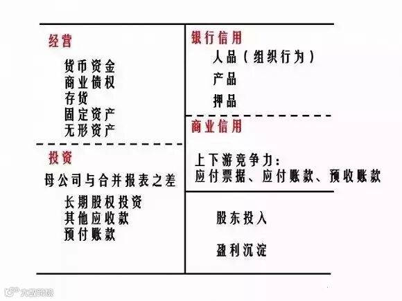 2、再看负债方面,其实所谓的负债就是一种信用,信用分为两种,一种是银行信用,一种是商业信用。银行信用主要是银行的短期借款和银行的长期借款。