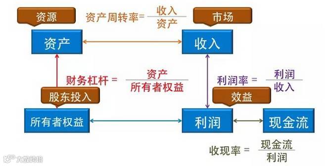 从“所有者权益”到“利润”,是一个通过“所有者权益”撬动了“资产”,又撬动了“收入”,再得到“利润”,这么一个循环的过程。但是对于我们所有者来说,最重要的是考虑我投了这100万进来,我到底赚了多少钱。也就是说,投资者最关心的是权益回报率又叫做ROE,就是下面的这个公式,权益回报率=利润÷所有者权益。经过一系列指标的换算之后,权益回报率=利润率×资产周转率×财务杠杆。这套方法非常有名,所有做财务分析的人都知道这套方法,叫做杜邦分析法。