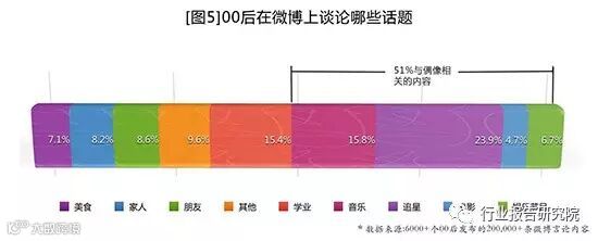 与80后不同,作为网络原住民的零零后的追星方式更偏重于感情寄托与身份的认同。调查显示,零零后51%的微博内容都与偶像相关[见图5],而社交媒体的存在,更史无前例的拉近了这些粉丝与偶像之间的距离,他们不仅可以选择穿戴与明星同款的服饰,更可以选择与偶像“共生”的生活方式。