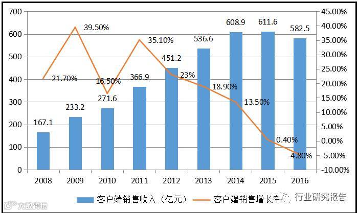 下图展示的是我国客户端游戏发展变化情况,2014年以前一直处于中高速增长,最近这两年处于停滞甚至是下滑的状态,说明客户端游戏市场在我国已经发展得相当成熟,由于产品并没有升级或者出现创新产品,客户端游戏市场很可能进入衰退时期。2016年客户端游戏市场规模为582.5亿元,平均每人消费373.4元。