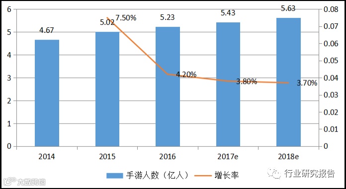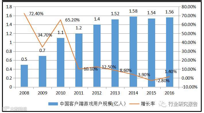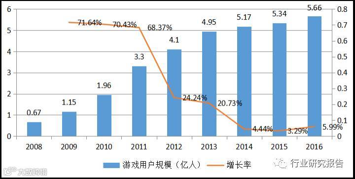 下图展示的是我国游戏用户规模的变化,在2011年以前游戏用户的增速是非常快的,达到70%以上,2012年和2013年保持着中高速增长,2014年以后用户增速趋缓,表明游戏用户增长已经进入成熟期,在不久的将来很可能用户不再增长甚至减少,2016年我国游戏用户达到5.66亿,占我国总人口的40%。