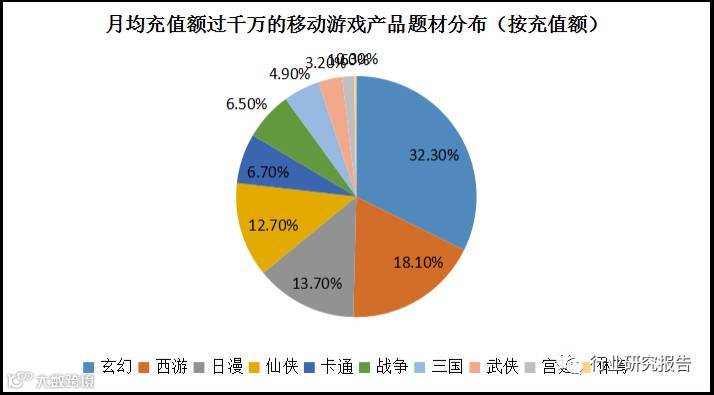 既然移动游戏是以上几类游戏中唯一还有增长的,我们下面来看一下游戏的题材和产品类型有哪些,下面图表显示了移动游戏的题材结构,在月均充值量超过千万的移动游戏中,排名前五的是玄幻、西游、日漫、仙侠和卡通,它们的占比合计83.5%,玄幻类移动游戏尤其突出,占比32.3%。