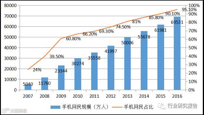 从下图中的手机网民看,我国手机网民的增速十分惊人,十年从五千万增长到七亿,平均年复合增长率大约是30%,手机网民在网民中的占比已经超过95%,几乎每个网民都有手机网民的身份,这主要得益于智能手机的出现和普及,手机的消费价格相比电脑低,可以移动并且上网更方便,很多边远地区的人们更有可能成为手机网民,这为以移动终端为基础的游戏市场的发展提供庞大的消费群。从CNNIC发布的统计数据了解到,截至2016年底,我国手机网络游戏的用户已经达到35166万人,占网民数量的50.6%,相比2015年的27928万人增长了25.9%,在手机互联网娱乐中占有很重的比例。