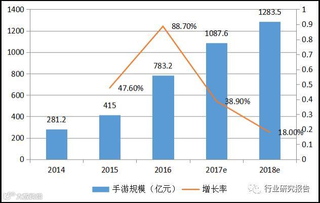 根据艾瑞咨询的数据预测,未来我国手机游戏规模将从目前的783.2亿元增长至2018年的1283.5亿元,增长速度迅速下滑,估计再过几年就进入个位数增长期,而从手机游戏的人数增长情况看,目前已经处于低速停滞阶段,预计未来用户基础不会有很大的增长,当前人数5.23亿,两年后增长到5.63亿。综合看来手机游戏行业还有三至五年增长,再往后将进入成熟时期。