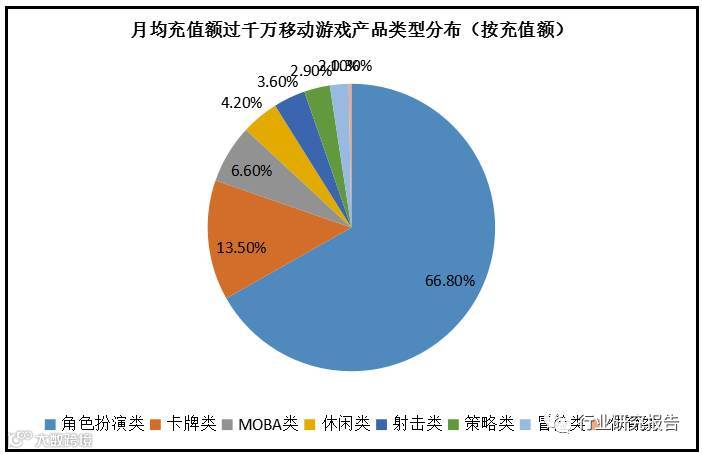 再来考察一下月均充值超过千万的移动游戏产品类型,占比最多的是角色扮演类,比例为66.8%,排名第二位的是卡牌类游戏,占比13.5%,排名第三的是MOBA类移动游戏,占比6.6%,合计占比86.9%。