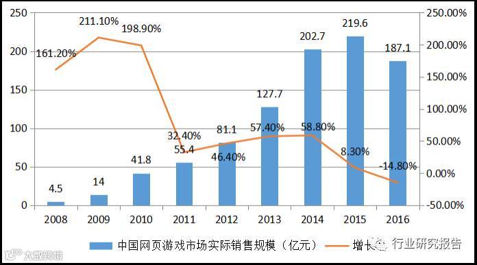下面两个图展示的是我国页面游戏的市场情况,我国页面游戏可以说是从2008年起发展到2015年成熟,经历了一个非常高速的增长阶段,年复合增长率为74.26%,进入2016年出现衰退,市场规模下降到187.1亿元,下滑了14.8%,平均每人消费68元。从用户规模看,从2013年以后就出现了规模下滑,至2016年用户规模缩小到2.75亿,下滑了7.5%,这些情况综合表明页面游戏行业已经进入衰退。