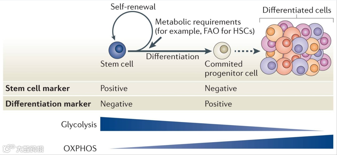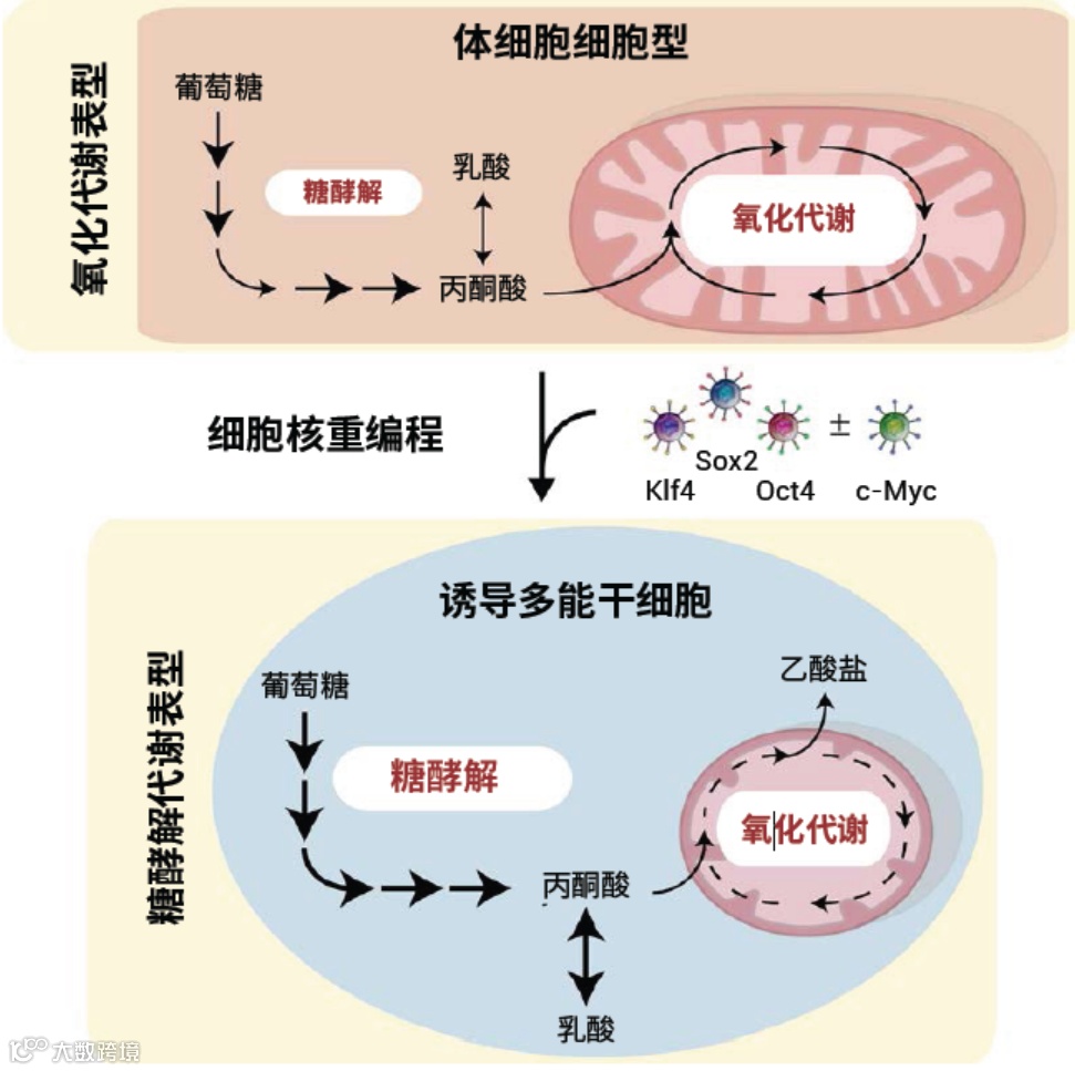 干细胞、体细胞和分化细胞都表现出特定的代谢特征。可测量的代谢转换事件以及所得的对糖酵解和/或氧化呼吸能量通路的偏好出现在细胞重编程、进入和退出多能状态、开始分化与终止分化的多个阶段