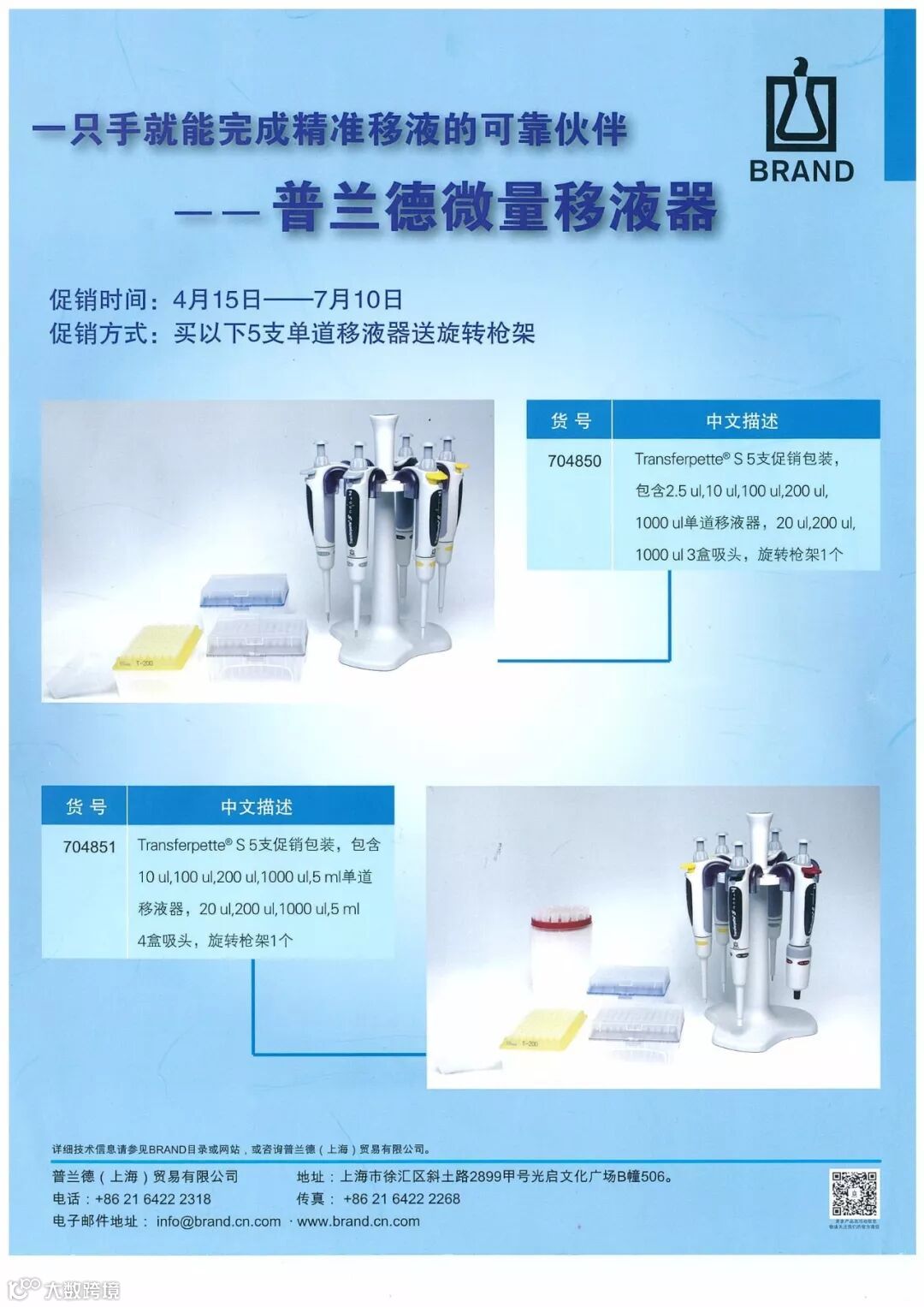 704851,套装包含:Transferpette® S 5支促销包装,包含10ul,100ul,200ul,1000ul,5ml单道移液器,20ul,200ul,1000ul,5ml 4盒吸头,旋转枪架1个