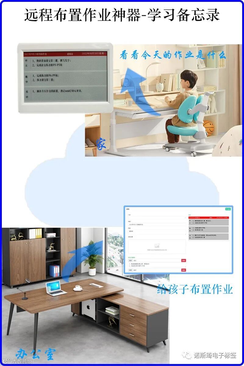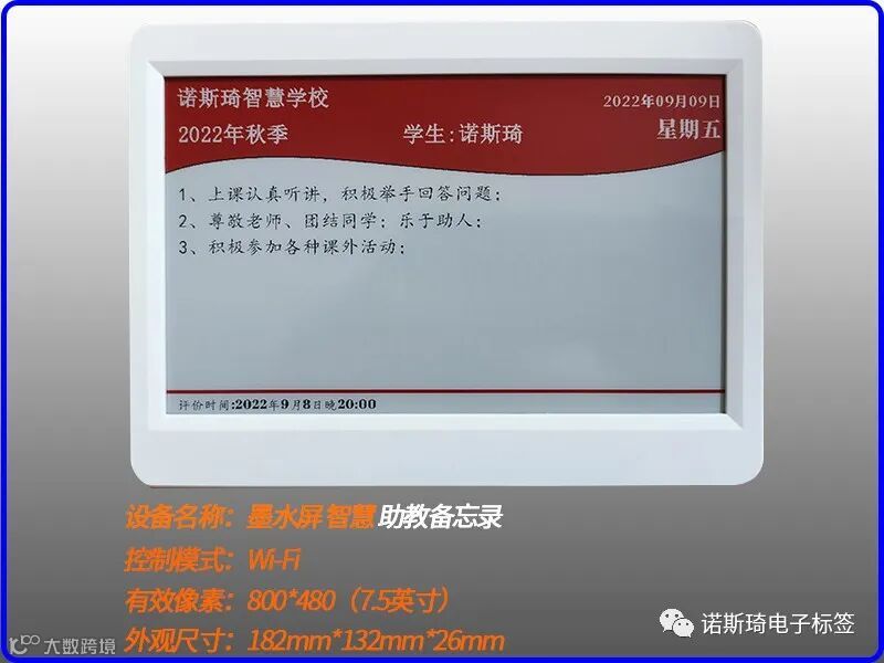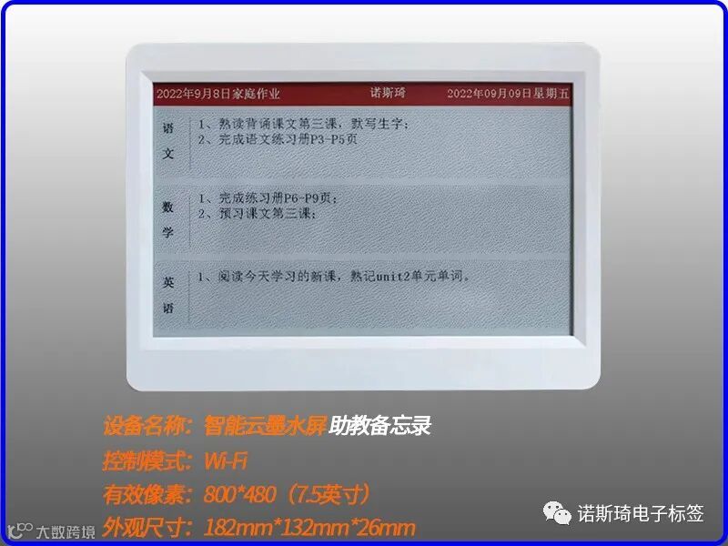 1、 学校开通诺斯琦智慧校园助教系统;给每个班级每个学生配置一台7.5寸WIFI墨水屏电子标签;