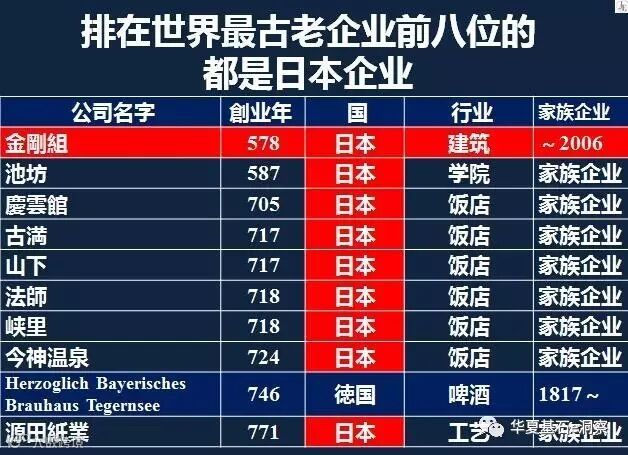 接下来我就日本的情况再做一个更加详细具体的说明。在日本有260多万家的公司,其中百年老店有25321家。其中超过200年的企业有3939家,300年以上的有1938家,而500年以上的有147家。令人吃惊的是1000年以上的企业竟然也有21家。其中排名第一的最古老的企业叫做金刚组,是一家木结构建造的公司,创立于公元578年,是现在世界上存续历史最悠久的一家企业。从创业历史来看,它已经有接近1440年的历史,并且因此入选了吉尼斯世界纪录。
