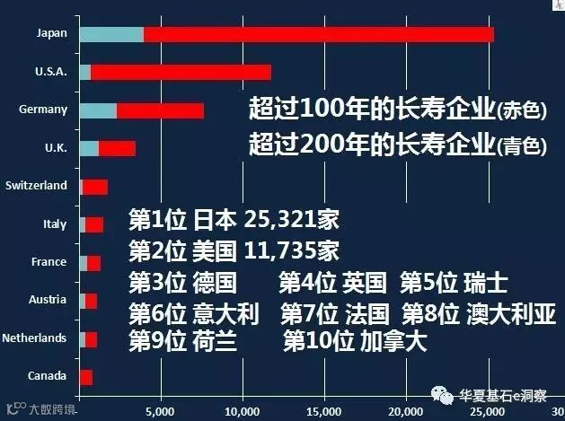 PPT上显示红色的是超过一百年以上的长寿企业。按国别来排序,前十位依次是日本(25321家)、美国(11735家)、德国、英国、瑞士、意大利、法国、澳大利亚、荷兰以及加拿大。除此之外,世界上还有136个国家都有他们的百年老店。