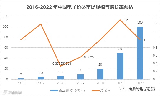 1、近几年,电子价签行业市场规模仍会继续扩大,增长率保持上升趋势,预计2022年将达百亿市场;
