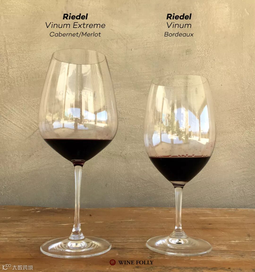 测试的两个酒杯分别是: 左:Riedel Vinum极致赤霞珠/梅洛水晶酒杯 右:Riedel Vinum“波尔多”水晶酒杯 |