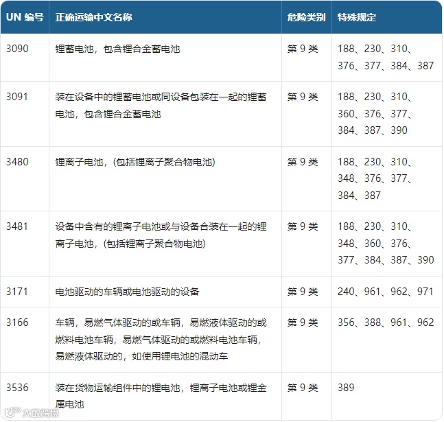根据 《国际危规》(40-20 版) 的分类,锂电池类货物属于 第 9 类杂项危险货物,主要包括了单独运输的锂电池、与设备一起运输的锂电池、含有锂电池的车辆和装在货运装置中的锂电池四大类。根据产品类型的不同,这四大类货物又细分为 7 个条目,具体对应的 UN 编号如下: