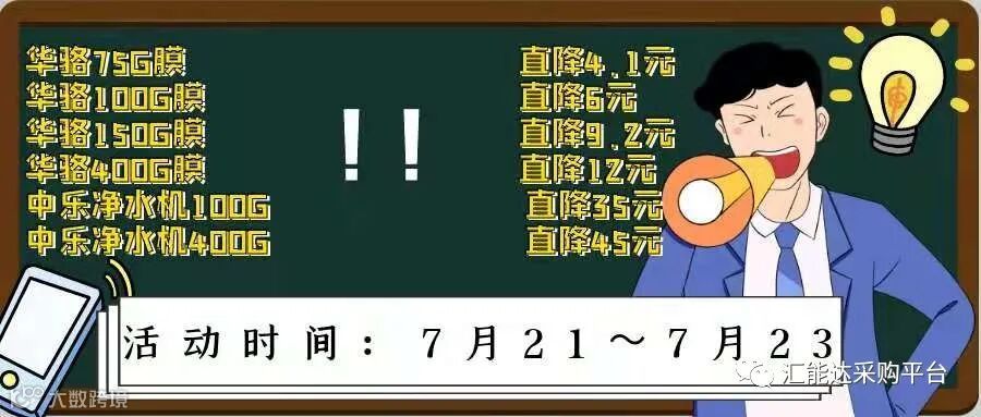 精彩即将绽放,汇能达平台明日开启 (反渗透RO膜)、(反渗透净水机)团购特价活动,活动时间:7月21—23日(三天),请您留意活动时间,避免错过活动优惠。