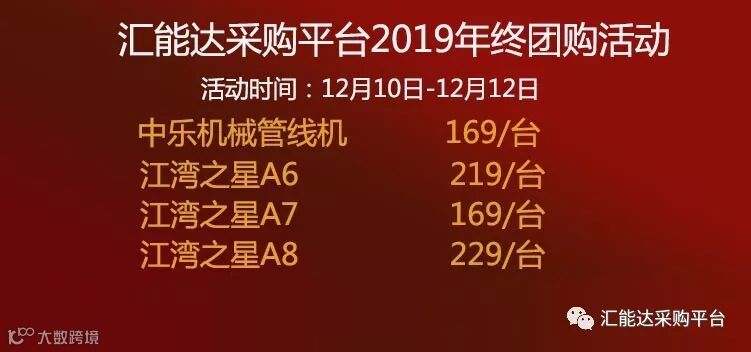 2019年春节来临之即,汇能达平台即将开展最后一期活动——管线机特价团购年货节,活动时间于明天12月10日正式开启。春节前最后一期活动,请各位家人提前备好库存,保证春节前后所需。