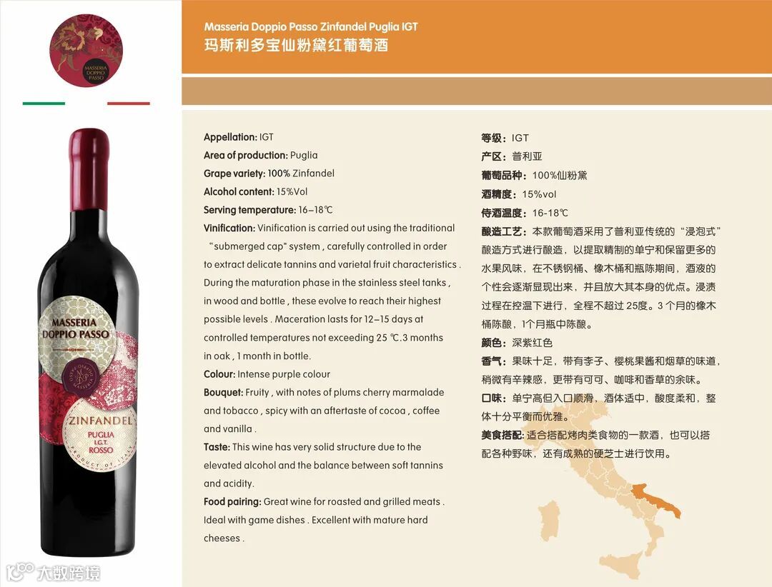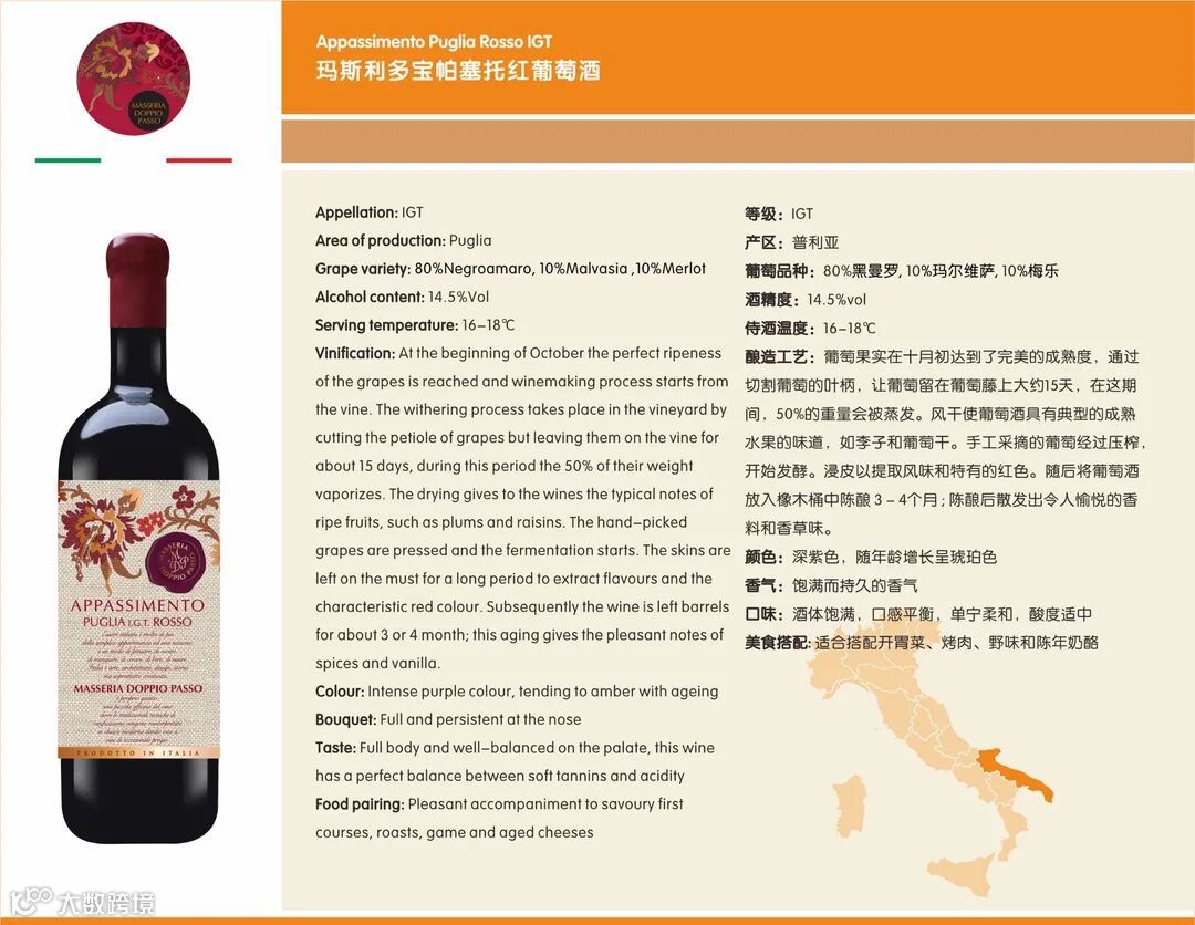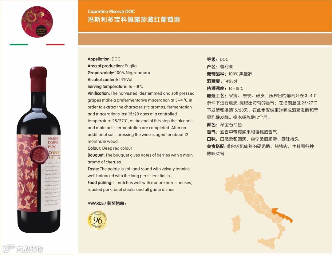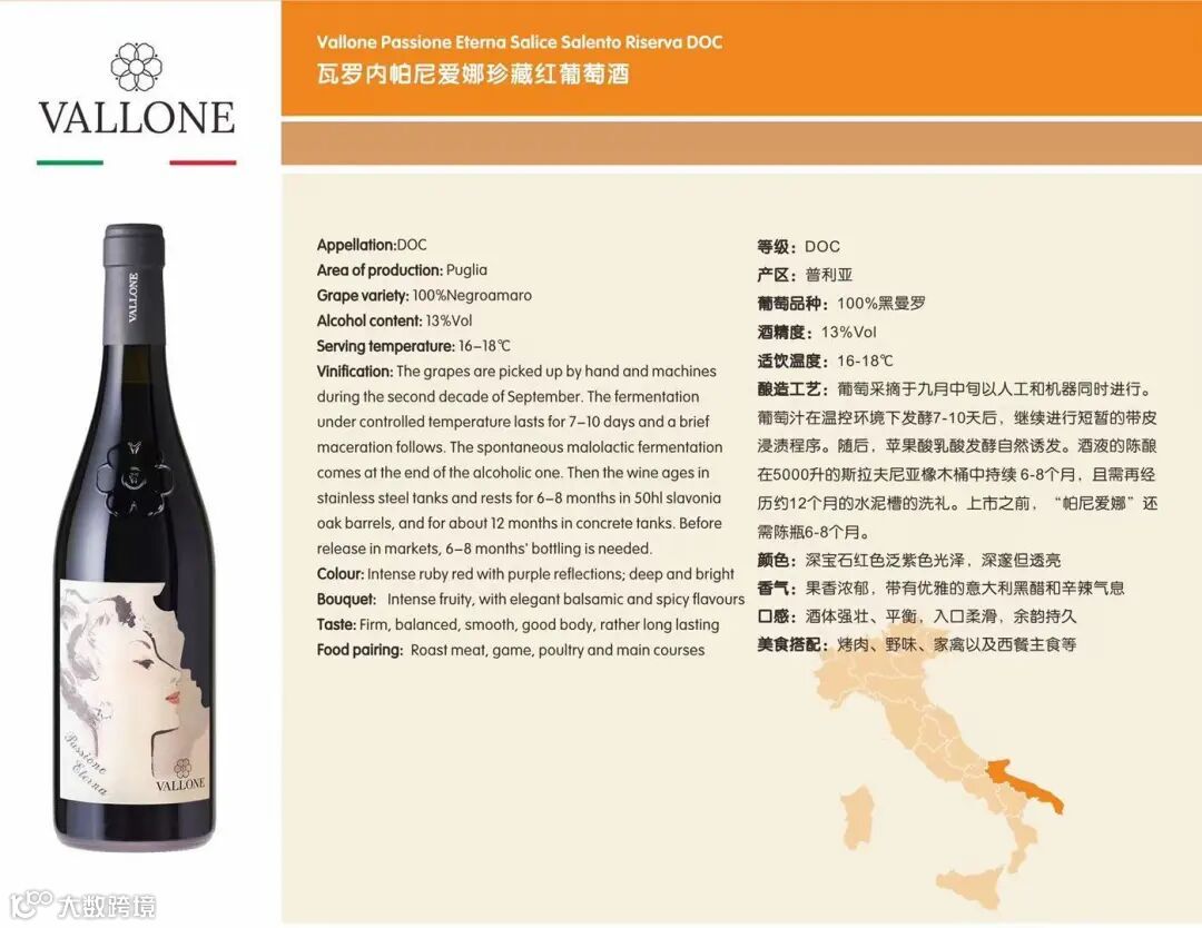 翻造工艺:本款葡萄酒采用了普利亚传统的“浸泡式”酿造方式进行酿造,以提取精制的单宁和保留更多的水果风味,在不锈钢桶、橡木桶和瓶陈期间,酒液的个性会逐渐显现出来,并且放大其本身的优点。浸渍过程在控温下进行,全程不超过 25度。3个月的橡木桶陈酿,1个月瓶中陈酿。