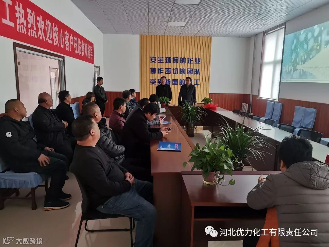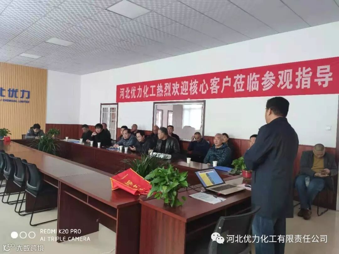 2019年11月10日上午10点,天气晴朗,河北优力化工有限责任公司核心经销商武邑县代理商杜总、夏津代理商刘总、盐山代理商郭总,带领部分二级经销商到河北优力化工有限责任公司考察参观,由河北优力化工有限责任公司市场部销售总监张总和李总负责接待讲解。