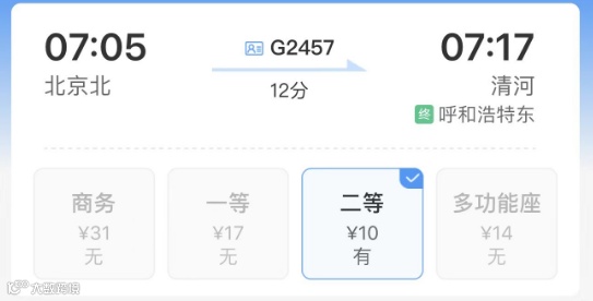 举个例子:北京北到清河的G2457次列车,二等座的票价为10元,购票后,您的乘车积分为50。
