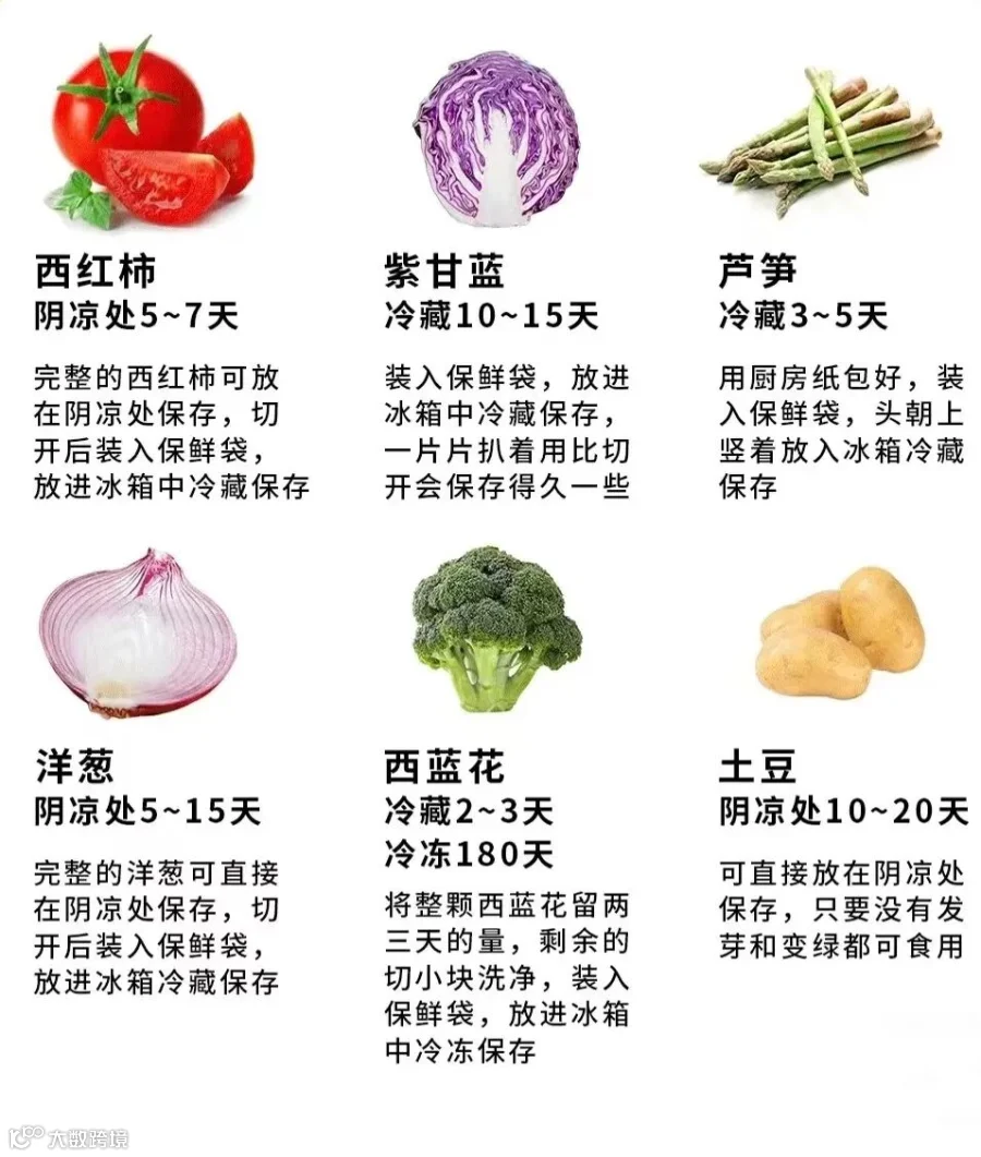 大白菜、卷心菜以及瓜类属于保存期比较长的蔬菜。根茎类胡萝卜、白萝卜、土豆、红薯紫薯等在常温下,可以储存半个月左右。土豆红薯紫薯不要放进冰箱,低温促进土豆发芽,还会让红薯冻伤。