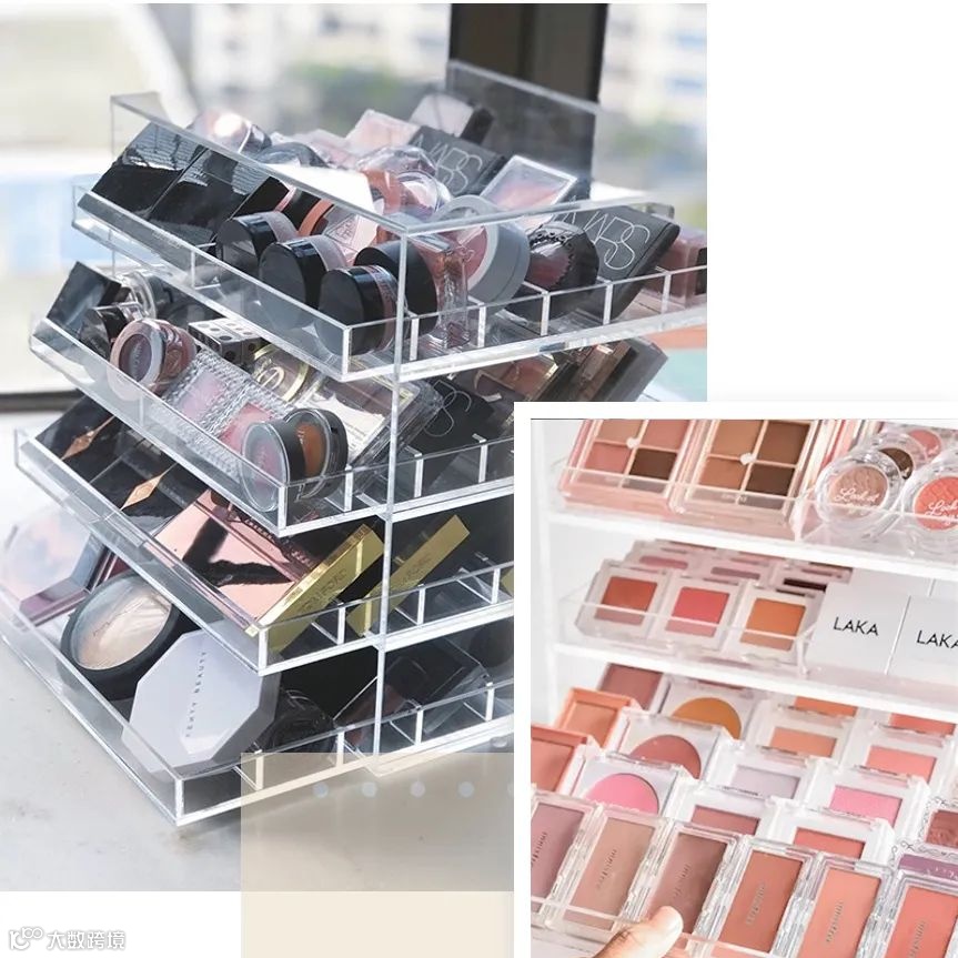 亚克力收纳盒,透明的收纳盒,大小不一满足不同的化妆品收纳的同时,让小仙女们可以一目了然什么色号的口红在哪里。亚克力材质的收纳盒价格便宜,分层的透明收纳,不会出现又贵又为了找一个腮红而翻乱了整个盒子的情况。