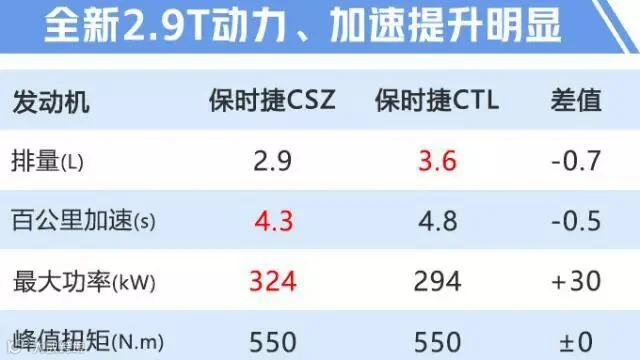 动力方面,保时捷新款Macan Turbo换搭一台2.9L V6双涡轮增压发动机,最大功率提升至324kW,峰值扭矩为550N.m。传动系统新车匹配7速PDK双离合变速箱,配备全时四驱系统,在选装Sport Chrono组件的情况下百公里加速仅需4.3秒,最高时速为270km/h。