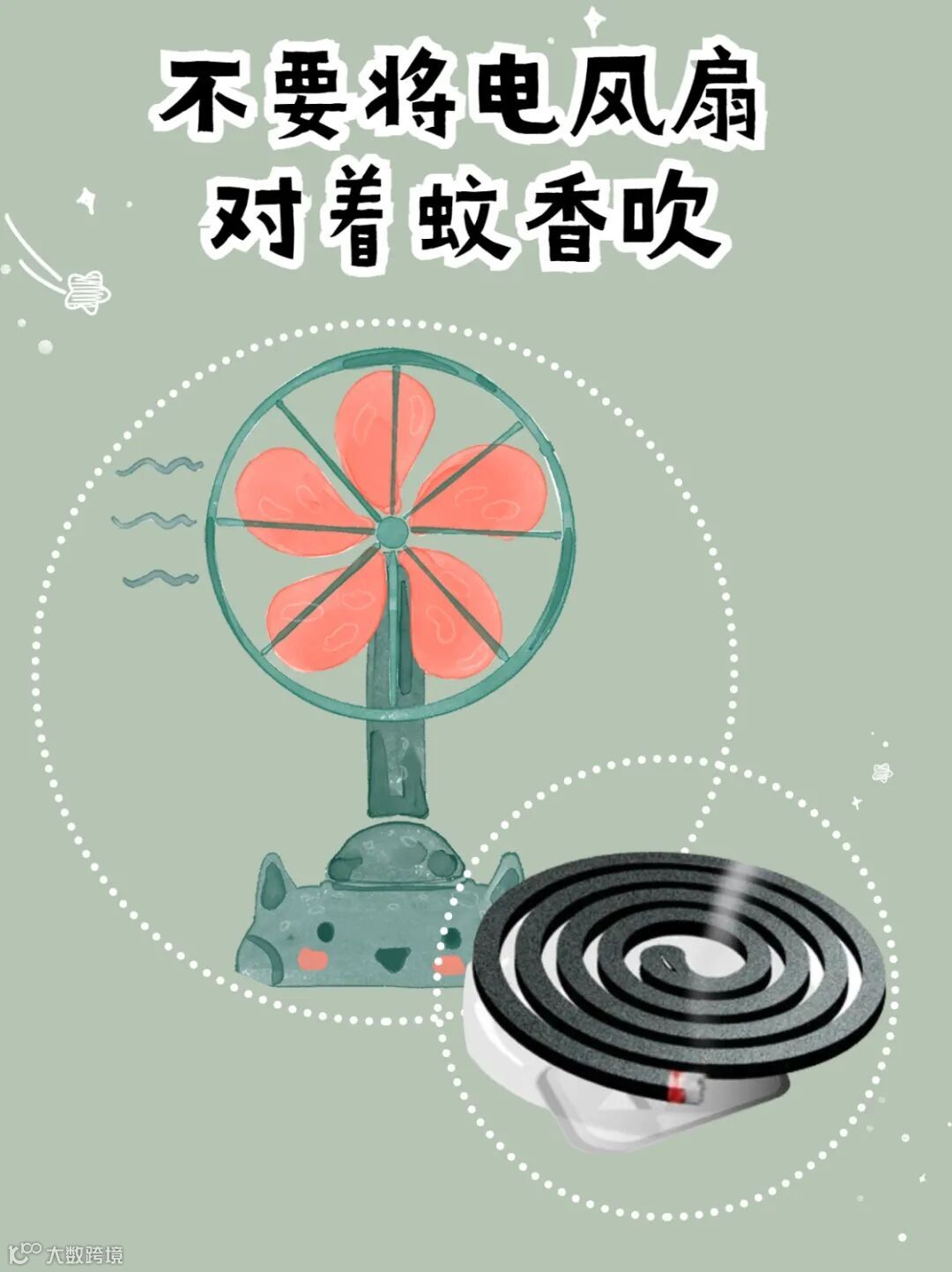 而且在使用电风扇时,将风对着蚊香直吹,容易吹散火星,还容易将衣物等可燃物吹落在蚊香上,引起火灾。