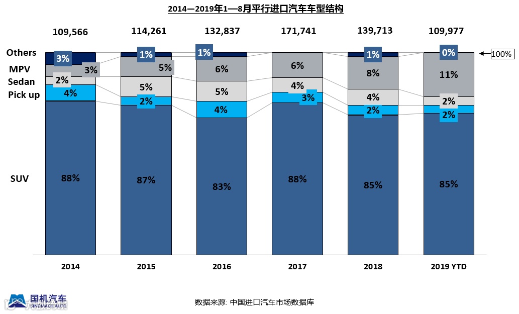 平行进口汽车市场以SUV为主体,2019年1—8月份额为85%;MPV份额为11%,较2018年份额提升3个百分点;其他车型份额保持相对稳定。
