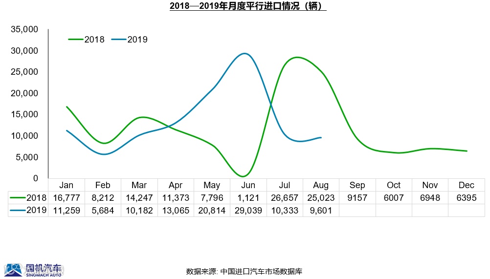 据国机汽车发布的数据统计:2019年1—8月平行进口汽车共109977辆,同比下滑1.1%,占进口总量的15.7%,与2018年同期相比提升3.1个百分点,其中8月当月平行进口汽车共9601辆,同比下滑61.6%。