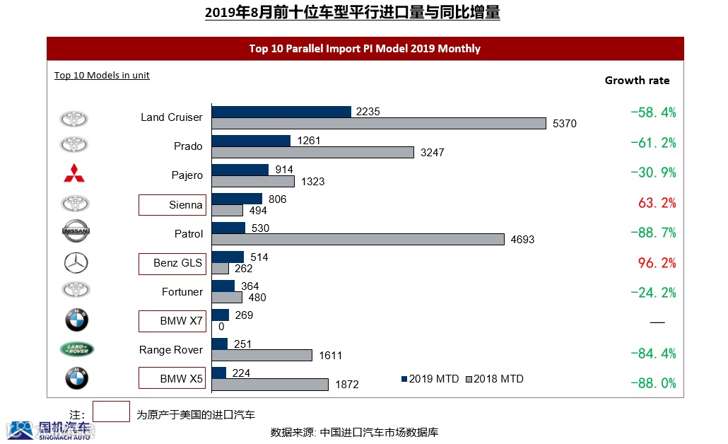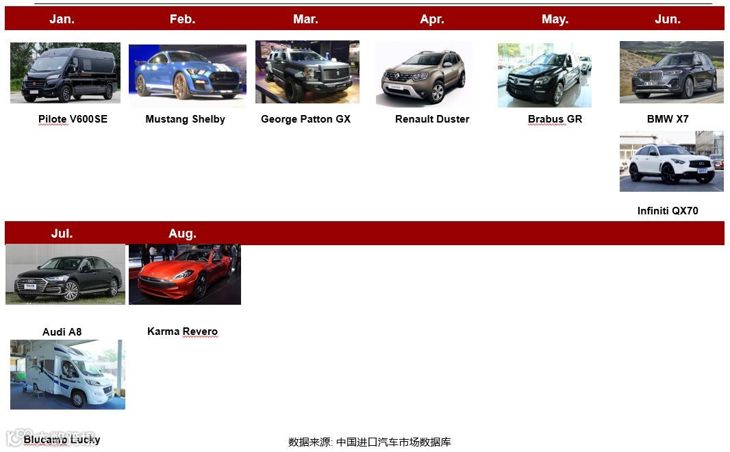 2019年1—8月以平行进口方式引入的新车型有10款,为Pilote V600 SE、福特 Mustang Shelby、USSV George Patton GX、雷诺 Duster 、奔驰 Brabus GR、宝马X7、英菲尼迪 QX70、奥迪A8、欧世邦Lucky、菲斯克卡玛Revero。