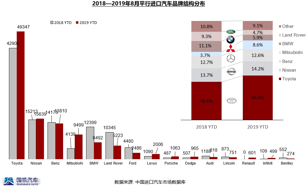 丰田是份额最大的品牌,进口规模领先,2019年1—8月份额达44.9%,日产和奔驰位居二、三位,前六大品牌累计份额为91%。品牌结构变化明显,丰田和三菱占比分别提升6.3和4.9个百分点,宝马和路虎分别同比下滑5.2和4.6个百分点。