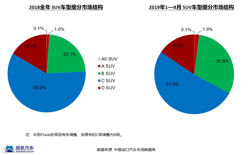 平行进口SUV以B、C和D级为主,2019年1—8月C级占比51.5%,相比2018全年下滑7.7个百分点;B级SUV占比提升达到30.8%,较2018全年增长7.7个百分点。