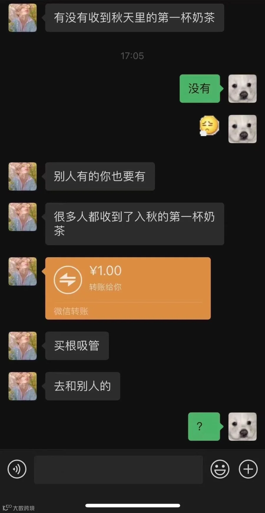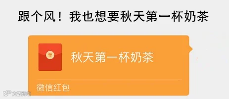 3、还有家里人和父母之间要秋天第一杯奶茶的红包,然后发到朋友圈里秀感情。