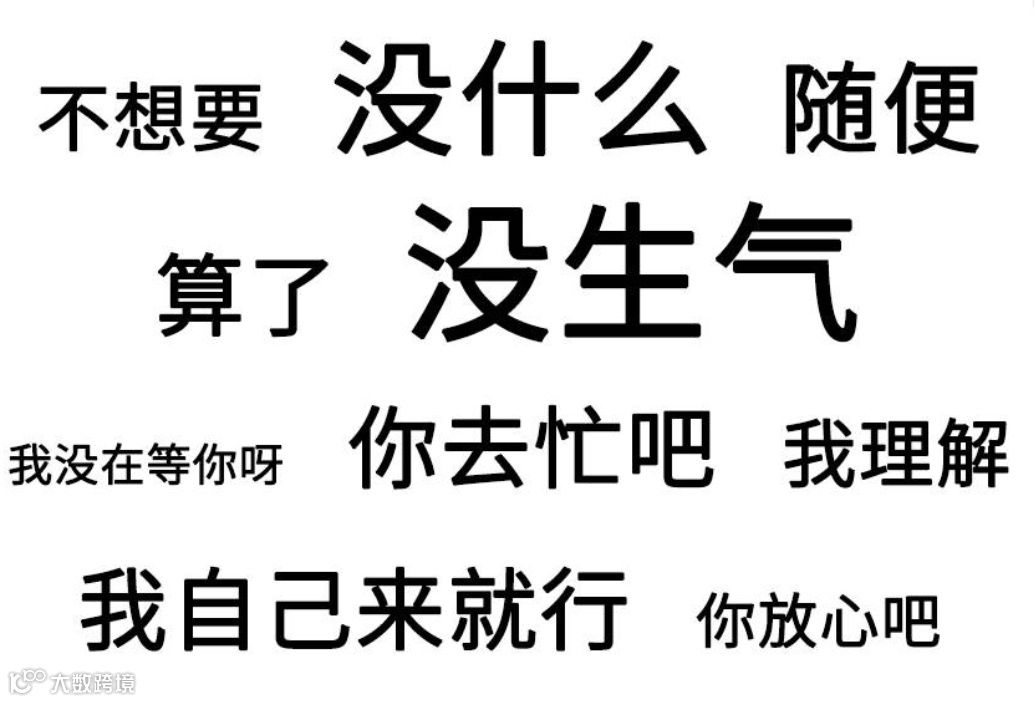 女朋友反话第一名应该就是这句了吧!当女朋友对你说:“我没生气,我真的没生气!”的时候,如果你真的傻呵呵的相信了,那你接下来将会遭遇几天甚至几个星期的冷暴力。