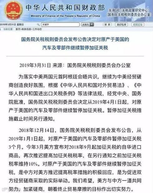 为落实中美两国元首阿根廷会晤共识,继续为中美经贸磋商创造良好氛围,根据《中华人民共和国对外贸易法》、《中华人民共和国进出口关税条例》等法律法规,经党中央、国务院批准,国务院关税税则委员会决定从2019年4月1日起,对原产于美国的汽车及零部件继续暂停加征关税。暂停加征关税措施截止时间另行通知。