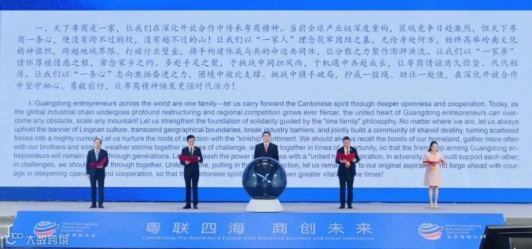 会上,全国人大代表、省工商联主席、省总商会会长、研祥高科技控股集团有限公司董事局主席陈志列等5位粤商代表宣读《全球粤商合作倡议书》,倡议全球粤商在深化开放合作中传承粤商精神,在持续健康发展中凝聚粤商力量,在建设一流湾区中作出粤商贡献,在助力走在前列中彰显粤商担当;以共识聚合力、以担当赴新程,共同谱写全球粤商合作共赢崭新篇章,共同传唱新时代新征程上更多“春天的故事”。