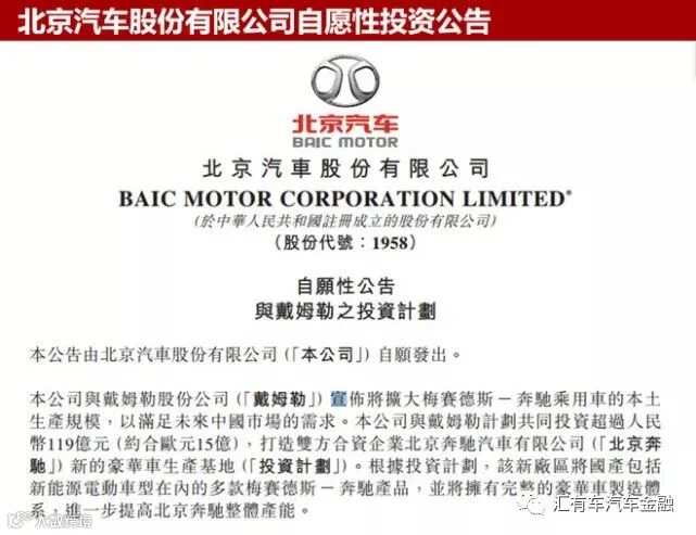 2月25日,北京汽车股份有限公司与戴姆勒股份公司宣布将扩大梅赛德斯-奔驰乘用车的本土生产规模,计划共同投资超过人民币119亿元,打造双方合资企业——北京奔驰新的豪华车生产基地。汇有车从北汽集团公告获悉:该新厂区将国产包括新能源电动车型在内的多款梅赛德斯-奔驰产品,并将拥有完整的豪华车制造体系,进一步提高北京奔驰整体产能。