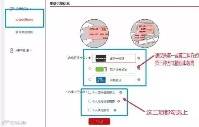 如下图所示:在线身份验证,为了确保您的信用信息不被他人查询,网上验证分为三种:银行卡验证、数字证书验证和问题验证。