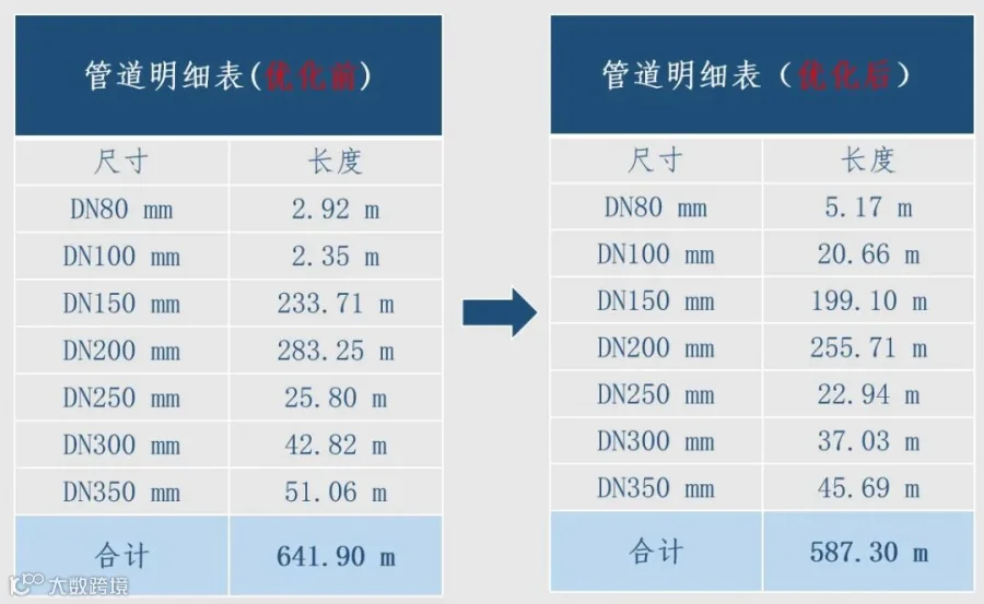 作为管综优化的结果,优化后的管综方案不仅更加整齐美观,管道耗材也相应的减少,此项目机房在管综优化后管道总长减少了54.6m,节省了约8%的材料。