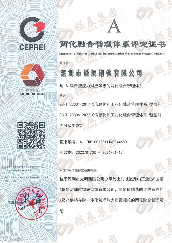 镒辰集团一直以来都在积极推进数字化、智能化转型。镒辰集团旗下广州市镒辰钢铁有限公司与深圳市镒辰钢铁有限公司通过投入资金、引进高端技术,以及不断推进自主创新,都成功地获得了“A级两化融合管理体系认证”。