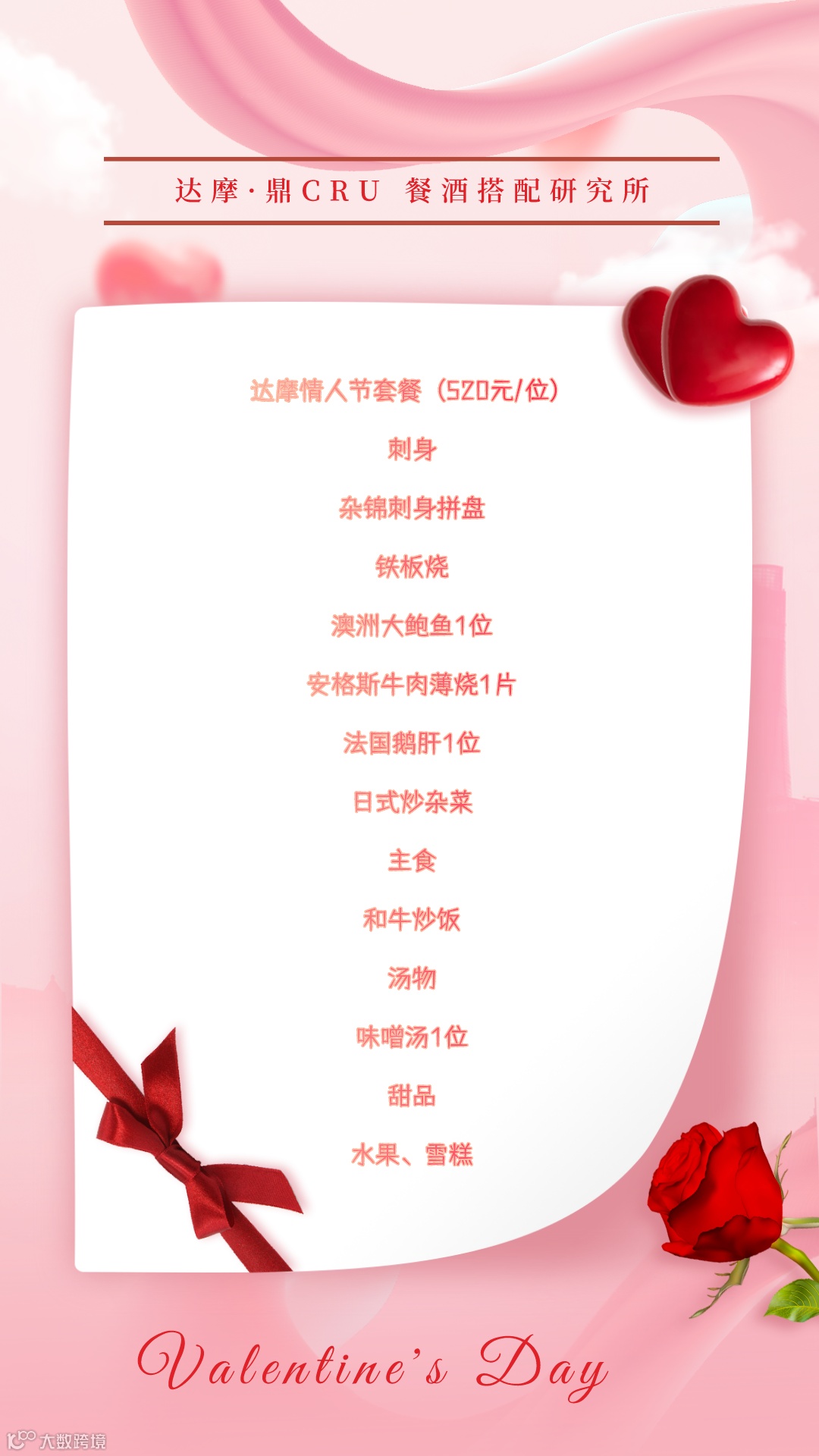 达摩情人节双人套餐:1999 RMB/2位
